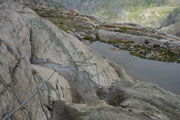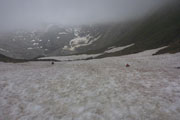 Am Nedersee gibt es für uns eigentlich nichts mehr zu sehen. Maximal 50 Meter beträgt die Sichtweite. Irgendwie fühle ich mich um eine wunderschöne Aussicht auf einen wahrscheinlich türkisblauen Gebirgssee betrogen. Aber es wird noch schlimmer. Stellenweise kann ich Jan 10 Meter vor mir nicht mehr erkennen. Dazu kommt noch, dass leichter Niederschlag auch noch meine Brille beschlagen lässt. Schwierigste Bodenverhältnisse über Steine und viele Rinnsale durch Feuchtgebiete erschweren das Ganze zusätzlich.