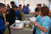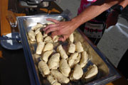 Schammelsdorf erreichen wir nach zwei Kilometern, die Brauerei Knoblach mit eigener Gastwirtschaft ist für den Frühschoppen mit einem „Räuschle“ zuständig, ich möchte den Zustand nicht schon kurz nach dem Start erleben und halte mich lieber noch etwas zurück. Ein Becher zum warmwerden reicht. Dazu werden noch Würstchen angeboten, das Fleisch stammt selbstverständlich vom Bauern aus der Region und wird wie das Bier vor Ort zubereitet.