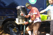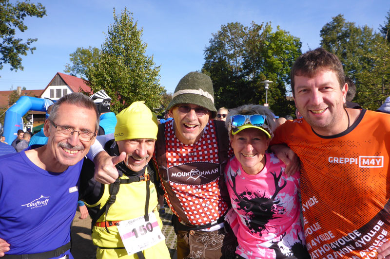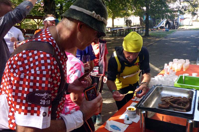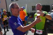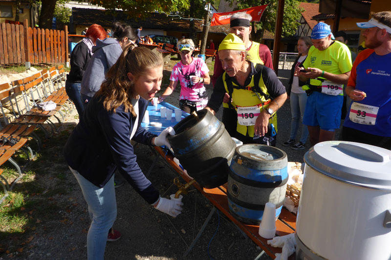 Knapp zwei Kilometer weiter erreichen wir die Almrauschhütte. Blasmusik empfängt uns. Greppi lässt sich das Bier von der Brauerei Ott direkt aus dem 5 Liter Fassl einflößen …echt dekadent. Nach 18 km werden wir mit 2:27 h gestoppt, da ist noch ordentlich Luft zum Limit.