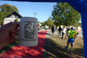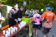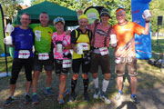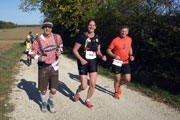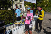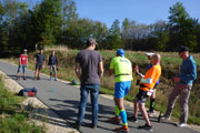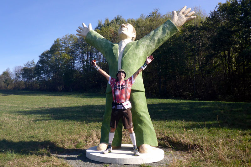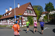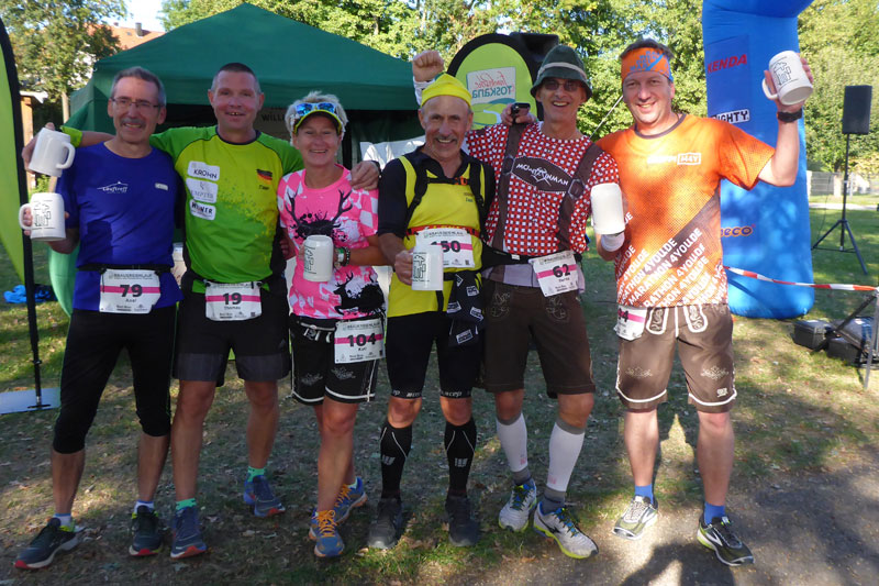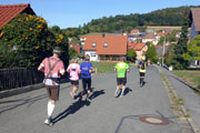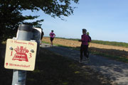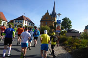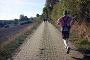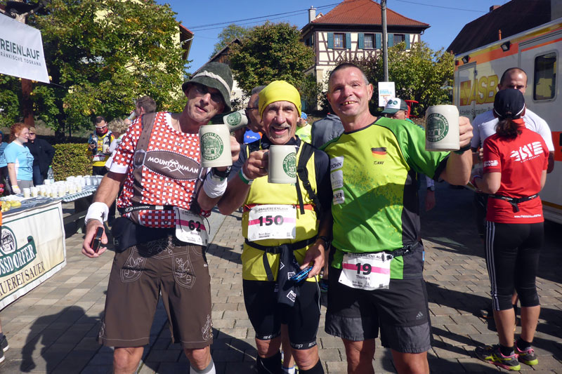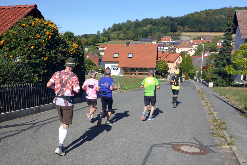 Gefällig verläuft unser Kurs immer auf und ab, es geht übers Land, durch Ortschaften und Wälder. Unerwartet hoch ist für mich anfangs unser Lauftempo, damit hatte ich gar nicht gerechnet und passt mir eigentlich auch gar nicht in den Plan, aber dann können wir uns dafür später mehr Zeit nehmen. Von Bier können wir vorerst nur träumen, die folgenden beiden Getränkestationen servieren ausschließlich Wasser und Iso. Wir sind schon leicht unterhopft.