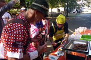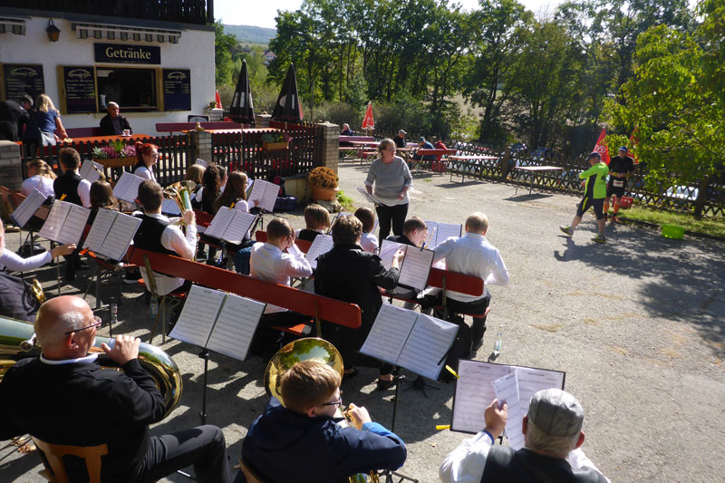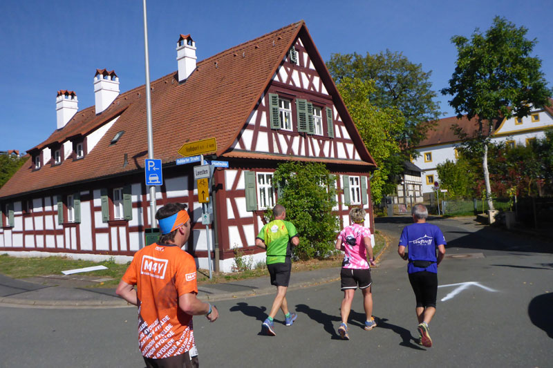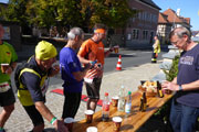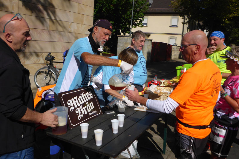 In Strullendorf gibt es Bier vom Mahrsbräu aus Bamberg, dazu Salzbrezeln und noch einiges mehr. Es geht jetzt Schlag auf Schlag, das Niveau steigt spürbar. Eine Ecke weiter serviert uns ein privater Stand „Aecht Schlenkerla Rauchbier“ …ja, hat was. Kurz darauf das 20er-Kilometerschild für uns. Wir sind mittlerweile eine kleine Gruppe mit sechs Personen und sind gut gelaunt, so kann’s weitergehen.