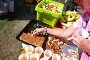 Das Schild vom Schwanenbräukeller lässt Vorfreude aufkommen, wir werden nicht enttäuscht. Zwar geht es nicht runter in ein Kellergewölbe, aber es gibt Rittmayer Hallendorf vom Faß. Wieder frisch gezapft. In Wernsdorf (km 24) werden wir in den Biergarten vom Gasthaus Schiller geleitet. Wunderbar lauschig ist es hier. Zu den Würstchen zapft uns der Schankkeller ganz frisch das Bier. Obst gibt’s auch, aber da langt niemand hin.
