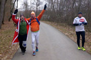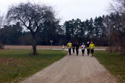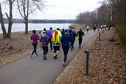 Kurz vor 14 Uhr scharrten schließlich 58 Teilnehmer vor dem Startbogen, der direkt am Ufer des Kleinen Brombachsees aufgebaut worden war. Einige hatten schon im Vorfeld angekündigt, dass sie nur zwei oder drei der fünf Runden laufen würden. Ich selbst hatte mir vorgenommen, heute äußerst entspannt meine Runden zu drehen. Der Xmas-Marathon ist mein 21. Marathon in diesem Jahr, da möchte ich es doch ruhig ausklingen lassen. So trabe ich nach dem Startschuss auch gleich ruhig los und finde mich relativ schnell im hinteren Teil des Feldes wieder. Neben mir läuft Manni, den ich schon von vielen anderen Läufen kenne. Er erklärt, dass er es heute ebenfalls langsam angehen lassen will. 5:30 Stunden will er sich für die 42 Kilometer Zeit lassen. Das klingt auch für mich nach einem entspannten Tempo und wir entschließen den Lauf gemeinsam unter die Füße zu nehmen. Bei einem Zeitlimit von sechs Stunden sind mir damit auch voll im Soll. Auf der ersten Runde laufen wir uns erst einmal warm und genießen die Strecke.