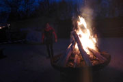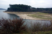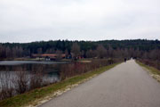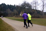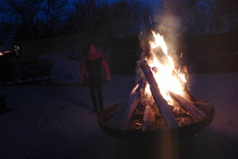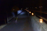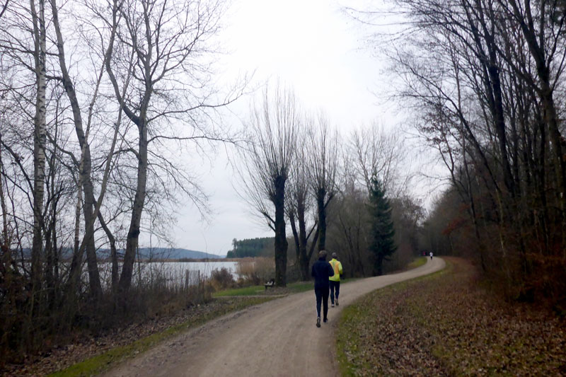 Es ist zwar bewölkt und lausig kalt, dennoch hat die Landschaft um den kleinen Brombachsee ihren Reiz. Während Manni und ich über vergangene Läufe sprechen, wandert unser Blick immer wieder einmal auf den See hinaus. Neben der Strecke stecken immer wieder Fackeln im Boden und etliche Teelichter sind ebenfalls schon bereitgestellt. Sie werden uns später in der Dunkelheit den Weg weisen. Dieser ist übrigens perfekt markiert. An den wenigen Abzweigungen, die in der Nacht eventuell zu Unsicherheiten führen könnten, sind Warnbaken mit Leuchten aufgestellt, so das ein Verlaufen unmöglich ist. Nachdem wir gut eine halbe Runde gelaufen sind, überqueren wir das erste Mal die Vorsperre und ja, Michael hatte Recht, es war spürbar kälter.