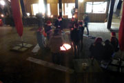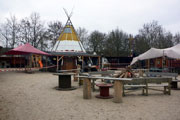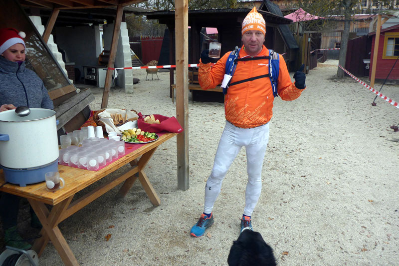 Direkt nach der Vorsperre ging es dann nach links weg, weiter am See entlang. Nach einem kleinen Anstieg dürfen wir auch gleich wieder etwas bergab laufen und erreichen ein paar Minuten später den ersten Verpflegungspunkt. Michael hatte das „San-Shine-Camp“ perfekt in die Strecke integriert. Das Outdoor- und Eventgelände gleicht einem Wild-West-Dorf und vor einem großen Tipi gibt es erstmals Tee und Lebkuchen. Diese Verpflegungsstelle ist Manni und mir gleich ans Herz gewachsen und wir werden hier jede Runde ein paar Minuten verlieren. Nicht nur die Verpflegung ist dafür ein Grund. Die wirklich rührigen Helfer und Helferinnen freuen sich stets über ein kurzes Gespräch und wollen wissen wie es so läuft. Frisch gestärkt machen wir uns auf den Weg. Weiter geht es am See entlang. Wir erreichen wenige Minuten später eine Brücke und als wir diese überquert haben, liegt auch schon wieder das Strandhotel vor uns. Die erste Runde wäre somit also absolviert. Beim Überqueren der Start- bzw. Ziellinie bekommen wir ein Gummiband um das Handgelenk, somit kann sich auch niemand eine Runde dazu schummeln. Die zweite Verpflegungsstelle ist hier ebenfalls aufgebaut und ich greife wieder zu warmen Tee und Lebkuchen. Die Stimmung hier ist gigantisch. Alle Helfer und Helferinnen feuern uns an und erfreuen sich sichtlich an ihrem Marathon.