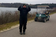 Die zweite Runde verlief ebenfalls reibungslos und wir trafen auf der Vorsperre auf Michael, der mit einem Golfwagen seine Runden drehte. Damit stellte er nicht nur sicher, dass niemand auf der Strecke blieb, er feuerte alle Teilnehmer auch lautstark an. Seine Begeisterung über den schon jetzt gelungenen Marathon war im dabei zu jeder Sekunde anzumerken. Natürlich ließen wir ihm auch ein paar Worte des Lobs zukommen, was er dankend entgegennahm. Nach der zweiten Verpflegungsstelle erlebten Manni und ich dann doch eine kleine Überraschung. Hatten wir auf der ersten Runde noch darüber spekuliert, wann uns wohl der Führende hier überrunden wird, waren wir uns noch ziemlich sicher, dass dies wohl in Runde drei oder vier passieren wird. Doch da hatten wir die Rechnung ohne Timo Striegel gemacht. Noch bevor wir zum zweiten Mal über die Starlinie liefen, zog Timo schon mit einem Affenzahn an uns vorbei.
