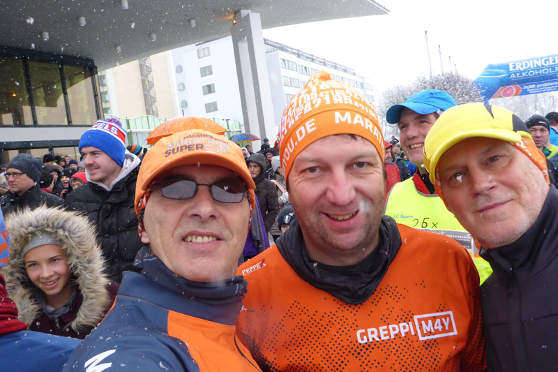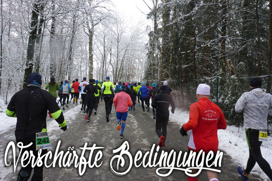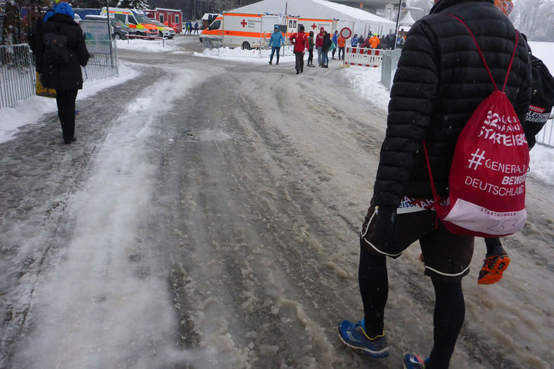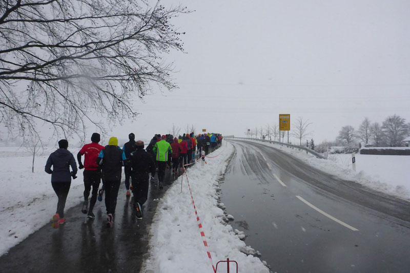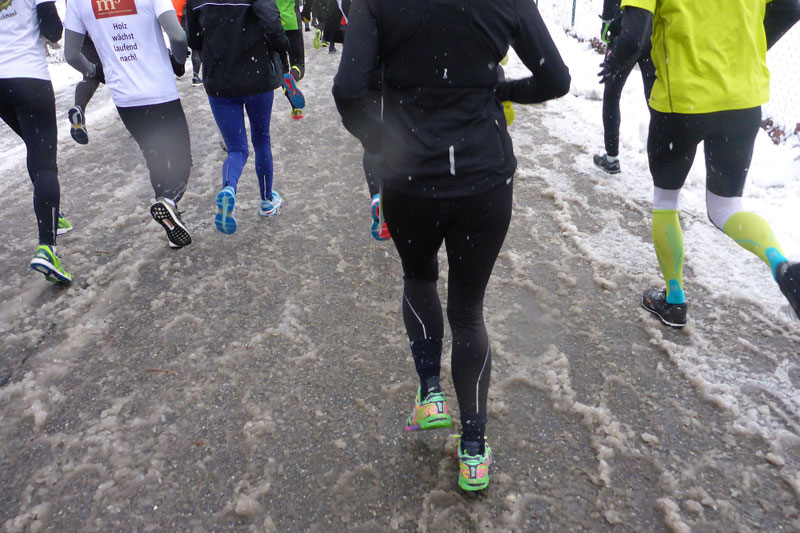 Auf der Empore am Haupteingang spielt die Blechbläsergruppe „Querdreiba“, mit dem Standkonzert kann man sich etwas die Zeit vertreiben. Als Schirmherrin fungiert heuer Anja Scherl, die Olympionikin von Rio gibt den Startschuss für alle Läufe. Sie gibt uns mit auf den Weg: „Passt auf Euch auf und hört auf Euren Körper.“ Die Startgerade ist völlig vereist und sorgt für verschärfte Bedingungen. Die Böllerschützen Hofmark haben sich wie immer gegenüber im Feld aufgestellt und schicken uns unüberhörbar auf die Reise.
