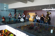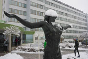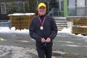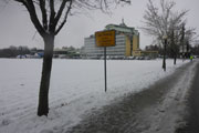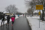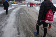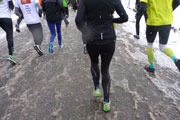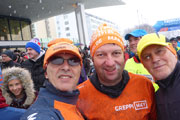 In der Therme wuselt es nur vor Menschen. An der Startnummernausgabe hat sich eine lange Schlange gebildet, da sollte man schon etwas Zeit einplanen. Nachmelden kann man sich auch an einem elektronischen Terminal. An mehreren Touch-Screen-Bildschirmen kann man vorab schon seine Daten eingeben. Richtig was los ist da aber nicht, finde ich. Kurz vor dem Start des Zehners wird bekannt gegeben, dass der Start für alle Läufe um 15 Minuten nach hinten verschoben wird. Wegen des Wintereinbruchs sind noch viele Teilnehmer auf den Straßen unterwegs und um noch einigen die Chance zu geben, doch noch rechtzeitig an den Start zu kommen, die Verschiebung. Dennoch schaffen es heute viele nicht mehr pünktlich.