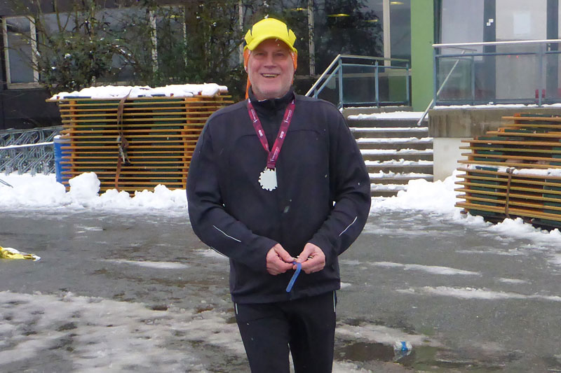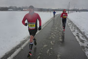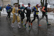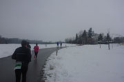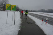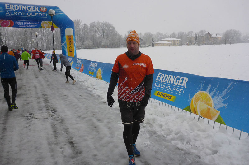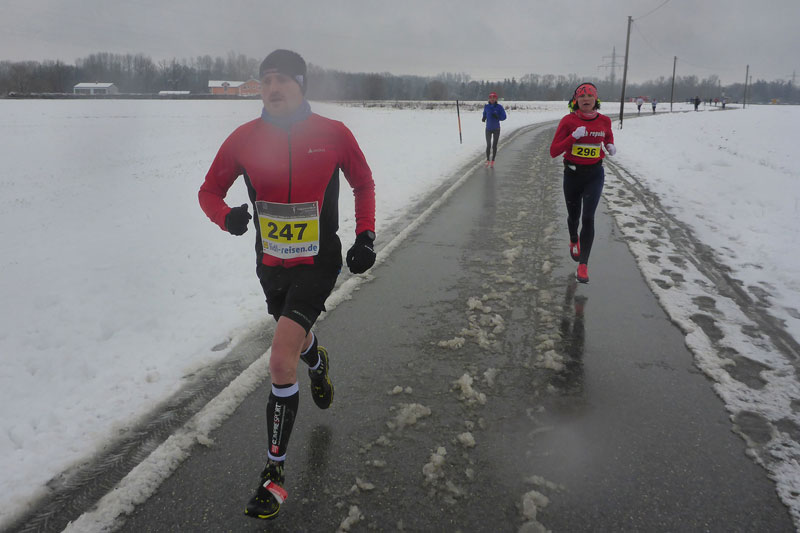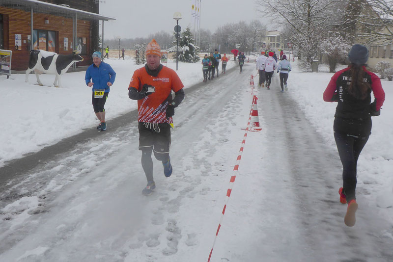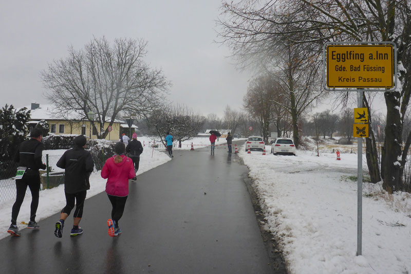 Die „neue“ Strecke hat sich auch schon wieder seit vier Jahren etabliert, aus ehemals zwei Runden beim Marathon sind damals vier geworden. Jetzt laufen wir eine 11er und eine 10 km lange Schleife jeweils zweimal. Runde eins führt uns am Ende der total vereisten Startgeraden scharf nach rechts. Nach dem Eis kommt teilweise fast knöcheltiefer Schneematsch. Nach einem Kilometer erreichen wir den Ortsteil Würding. Wer hier noch trockene Füße hat, hat gutes Schuhwerk. Ich habe meine Trailschlappen gewählt mit Profil und aus einigermaßen wasserresistentem Material. Nützt heute trotzdem nix. Hinter mir kommt der Pumuckl, heute als Mozart und mit Schuhen unterwegs und das hat einiges zu bedeuten. Ich bin heute bereits zum 10. Mal in Bad Füssing am Start, so schwierige Bodenverhältnisse gab es in diesen Austragungen noch nie.