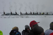 Aber dann kommt wieder mal alles ganz anders. Um 4 Uhr in der Nacht fängt es heftig zu schneien an und verzaubert die Landschaft in einen Wintertraum unter einer 20 cm dicken Schneeschicht. Da sind auch die vielen eifrigen Helfer vor Ort nicht mehr in der Lage das alles weg zu schippen. Zu Fuß spazieren wir die 10 Minuten von unserem Hotel zum Bad, da können wir uns bereits ein Bild machen, wie der Streckenuntergrund so ausschaut. Wird nicht einfach. Ansonsten aber sieht die Winterlandschaft mit noch immer leichtem Schneefall toll aus und das hat ja auch was für sich.