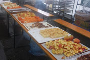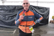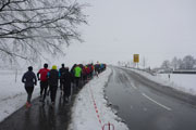 Theo, Albert und Martin schließen auf mich auf. Die drei sind die einzigen, die bisher an allen 26 Austragungen am Start waren. Zum Jubiläumslauf im Vorjahr haben sie sich eigene Shirts mit aufgedruckter Schärpe machen lassen. Nach etwa drei Kilometern höre ich hinter mir einen lauten Schepperer. Ein Busfahrer, der keine Möglichkeit sah, die abgesperrte Laufstrecke zu überqueren hat den Rückwärtsgang eingelegt und dabei einen hinter ihm wartenden PKW übersehen. Greppi und einige Dutzend Läufer sind so Zeuge von einem deftigen Auffahrunfall geworden. Ja, heute ist richtig was los. Die erste Verpflegungsstation erreichen wir nach 4,5 km. Für mich ist der warme Tee die optimale Wahl.