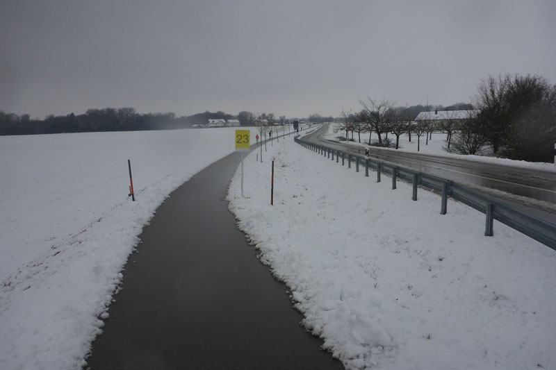 Nach anderthalb Kilometer erreichen wir die einzige richtige „Berg-Herausforderung“ des Kurses. Die Überführung kann „stolze 6 Höhenmeter“ aufweisen und ist damit der einzige Aufstieg auf der sonst topfebenen Strecke. Obwohl mir am Ende des Tages mein GPS 190 Höhenmeter einreden will. Spüren tut man die jedenfalls nicht. Immer geradeaus weiter geht es auf einem Radweg. Hier sind auch längere Abschnitte frei von Schneematsch.
