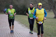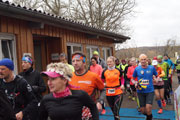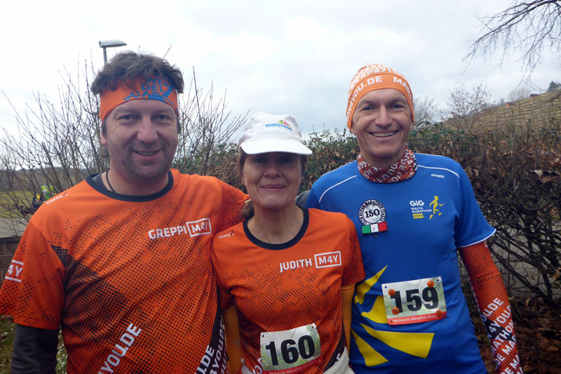 Schließlich hole ich mir meine Startnummer und meinen Zeitmesschip ab. Danach bleibt noch gut eine Stunde Zeit, die nach und nach eintrudelnden Lauffreunde zu begrüßen. Der LIWA-Lauftreff, zu dem ich ja eine besondere Beziehung pflege, stellt heute exakt zehn Prozent der Teilnehmer, so dass es nicht kurzweilig wird. Mit den beiden Fenders, Andreas Bettingen und Judith Strack ist aber heute auch das marathon4you-Team gut vertreten. Auch die üblichen Verdächtigen wie Kathi, Conny, Theresia, Andy, die beiden Axels, Olaf und Chris sind natürlich wieder mit am Start. Gefühlt kenne ich das halbe Teilnehmerfeld und so bin ich doch etwas überrascht, als Michael zum Megafon greift und uns bittet, dass wir uns doch alle hinterhalb der Zeitmess-Matte aufstellen möchten. Ach ja, da war ja noch was. Wir müssen ja noch einen Marathon laufen. Die Gespräche verebben und wir sind bereit. Ich sortiere mich relativ weit hinten im Feld ein. Das wird heute nur ein längerer Trainingslauf und ich will mir wirklich Zeit lassen. Axel und Kathi sehen das ebenso und sind gleich an meiner Seite. Cinzia ist von unserem Vorhaben überzeugt und schließt sich ebenfalls an.