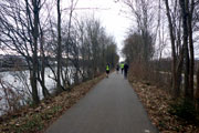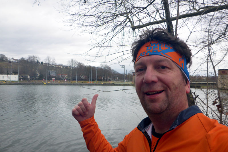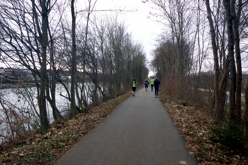 So ist es schließlich so weit. Um Punkt neun Uhr gibt Michael den fünften Neckarufer Marathon frei. Erst einmal geht es immer am Neckar entlang in Richtung Norden. Unser Quartett macht sich im hinteren Drittel gemeinsam auf den Weg, begleitet werden wir noch von Klaus und Olaf. Eine wirklich spaßige Truppe. Die Strecke kann auch das vergrößerte Teilnehmerfeld problemlos aufnehmen und es lässt sich von Anfang an gut laufen. Auch das Wetter ist ideal. Es ist zwar bewölkt und die Sonne wird heute kaum eine Chance haben. Aber es soll trocken bleiben. Vom angekündigten Starkwind, wie es bei meinem Wetterdienst so schön heißt, ist ebenfalls noch nichts zu merken.