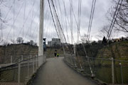Kati und Cinzia warten wieder auf uns und es geht gleich weiter auf die zweite, elf Kilometer lange Schleife, die uns bis nach Bad Cannstatt führen wird. Für mich ist die zweite Schleife die schönere und ich freue mich schon richtig drauf. Erst mal geht es auf dem Damm zwischen Neckar und Max-Eyth-See entlang. Auffällig ist für mich ist das große Aufkommen von diversen Gänsen, die nahezu überall durch die Grünfläche watscheln und natürlich auch überall ihren Dreck hinterlassen. Aber die Gänse lassen uns in Ruhe und so störe ich mich auch nicht weiter an ihnen. Schließlich biegen wir im Park nach links ab und müssen um eine Pylone herum wenden. Die Strecke ist vermessen und bestenlistenfähig, daher müssen wir diese paar Meter Umweg in Kauf nehmen. Danach überqueren wir eine auffällige Fußgängerbrücke, die uns wieder über den Neckar führt. Die Hängebrücke wird bei den Schwaben scherzhaft auch „Golden Gatele“ genannt, womit die Optik wohl auch schon zur Genüge beschrieben wäre.