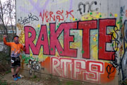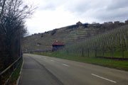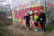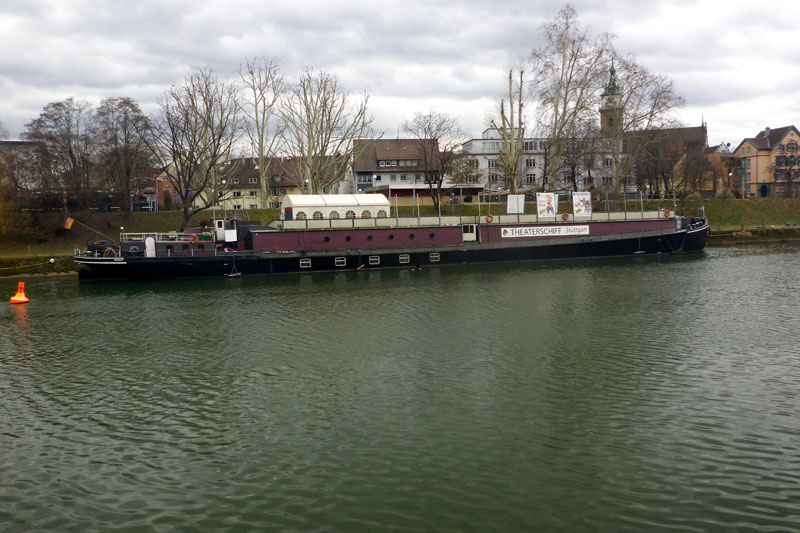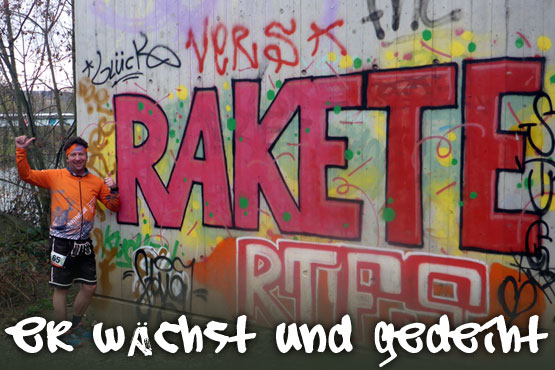 Gleich nach dem Golden Gatele geht es scharf links weg und weiter auf der Austraße. Hier finden wir ein großes Weingut und traben nun an den bekannten Weinbergen „Cannstatter Zuckerle“ vorbei. Schon bald laufen wir auf einem überdachten Fuß- und Radweg am Neckar entlang. Die Mauer neben uns ist über und über mit Graffitis versehen, ohne dabei schmuddelig zu wirken. Schon bald warten Kati und Cinzia auf uns. Es gibt einfach keinen Neckarufer Marathon ohne ein „Rakete“-Bild. Kati und Cinzia wollen ein gemeinsames. Ich hole mir meines erst auf der zweiten Runde. Danach kommen wir noch am gewaltigen Kraftwerk Münster vorbei und haben schon fast die nächste Verpflegungsstation erreicht. Wir bedienen uns wieder reichlich am Kuchen- und Keks-Buffett und schwappen das ganze mit einem Schluck Cola runter. Nach einer kurzen Rast geht es weiter. Bad Cannstatt liegt nun vor uns und linkerhand kann ich die „Frauenlob“, ein Theaterschiff auf dem Neckar dümpeln sehen. Damit ist auch die Wilhelmsbrücke erreicht und wir überqueren nochmal den Nackar und es geht wieder zurück in Richtung Zielbereich.