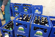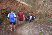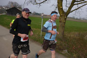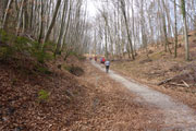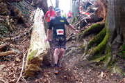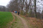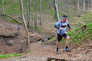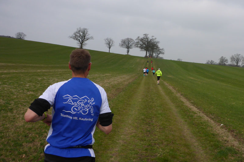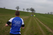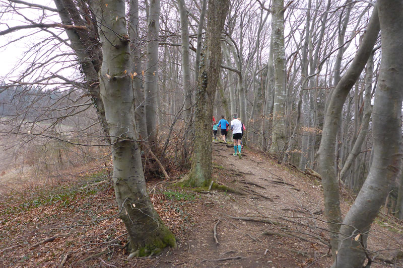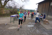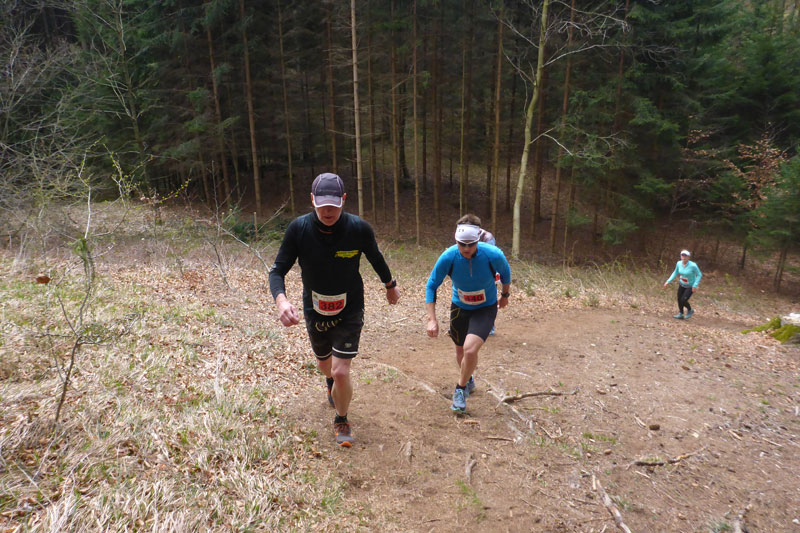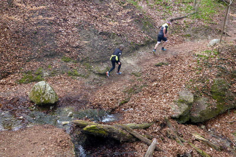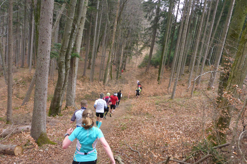 Beim Eintritt in den Forst, hat man scheinbar in den letzten Jahren eine kleine Streckenkorrektur vorgenommen, etwas früher als bei den ersten Ausgaben geht’s rein. Wunderbare Singletrails warten hier auf uns. Immer leicht rauf und runter führen die Trails durch den Wald. Ein echter Trailtraum, herrlich zu laufen. Nach gut 5 km verlassen wir wieder den Wald. Ab hier kann ich mich wieder an die frühere Strecke erinnern. Von links stoßen die Teilnehmer des Beginner Trails auf uns. Etwa anderthalb Kilometer führen über Feld- und Wirtschaftswege zum nächsten Waldstück. Vorher dürfen wir noch beim Durchlauf eines Hofes Getränke aufnehmen.