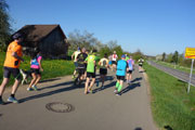 Nach 5 km erreichen wir Hepsisau …und wissen nicht mehr weiter. Auf der Straße gibt es ein paar irreführende Markierungen, die blauen Pfeile auf der Straße sind widersprüchlich. Vor uns sind auch schon einige in dieser zweifelhaften Pfeilrichtung unterwegs. Da hilft jetzt alles nix, der Plan muss raus, den uns Conny mit der Startnummer ausgehändigt hat. Mittlerweile hat sich eine größere Gruppe angesammelt. Der Manne weiß weiter, ein LKW hat die orangenen Markierungen am Verkehrsschild zugeparkt.