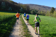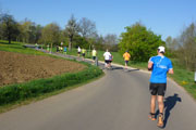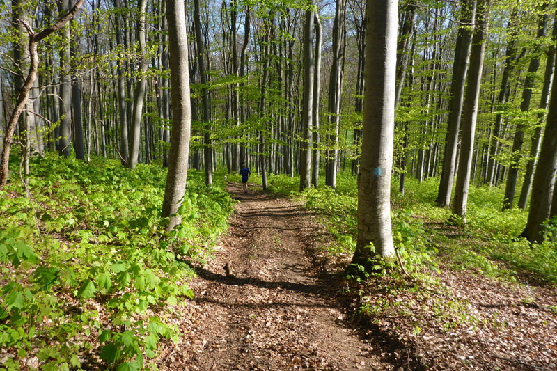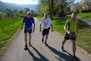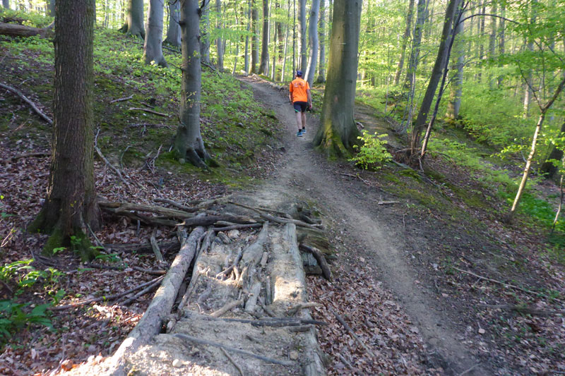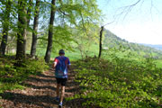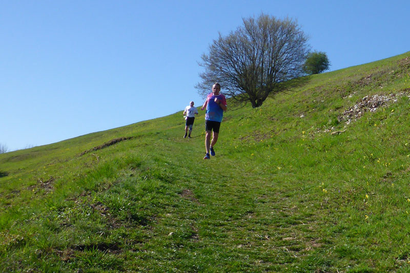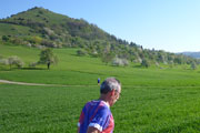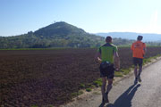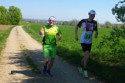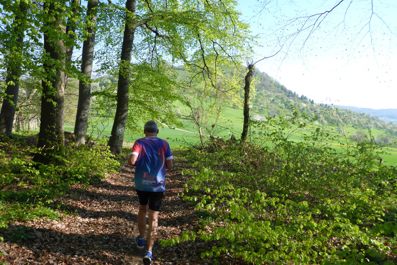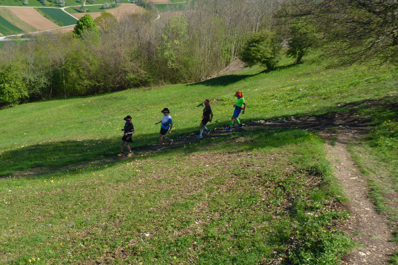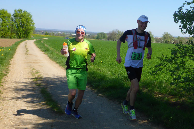 Auch anfangs Runde drei ändert sich wenig, niemand unmittelbar vor oder hinter mir. Aber von hinten kommen bald Kalle und Markus, die beiden Führenden überrollen mich nach 25 Kilometern. Ich spüre die schnellere Schleife deutlich in den Beinen, die 2 – 6 % Steigung auf der Alten Bissinger Landstraße werden sehr zähflüssig. Dann die Kontrolle. Tatsächlich, ich habe eine kleine Schleife nach rechts vor Hepsisau in der letzten Runde ausgelassen, das sind schon ein paar eingesparte Meter. Das ärgert mich. Nach dem Wald-Trail geht es kurz auf Asphalt weiter. Sch… wieso laufe ich hier solange bergab? Schon wieder verfranst, diesmal bin ich zu weit gelaufen, ich muss querfeldein durch Wiesen ein Stück zur Limburg aufsteigen. So hab ich die vorhin abgekürzten Meter, jetzt zum Teil wieder augeglichen.