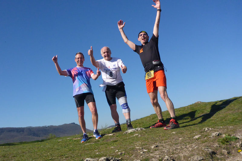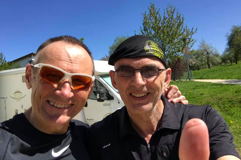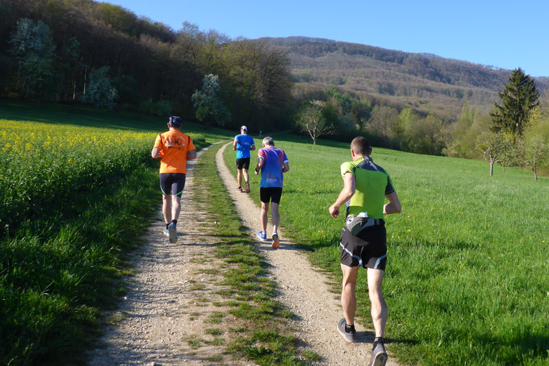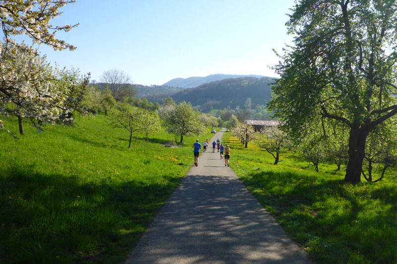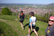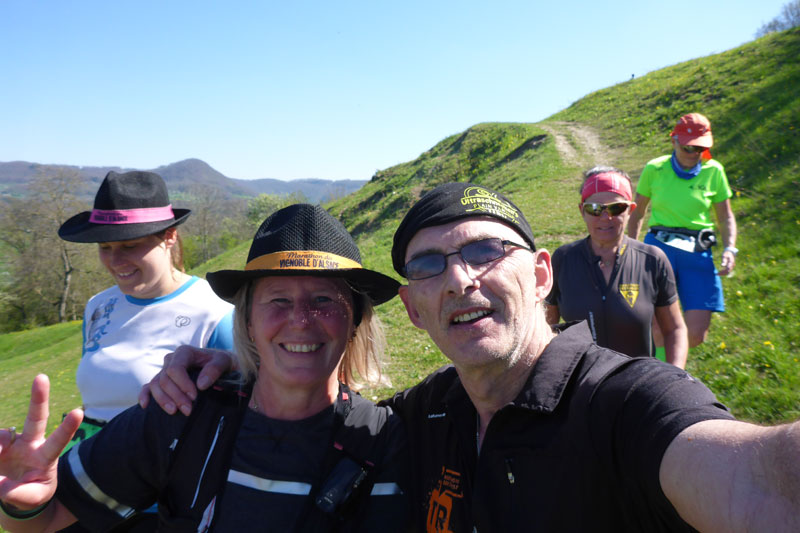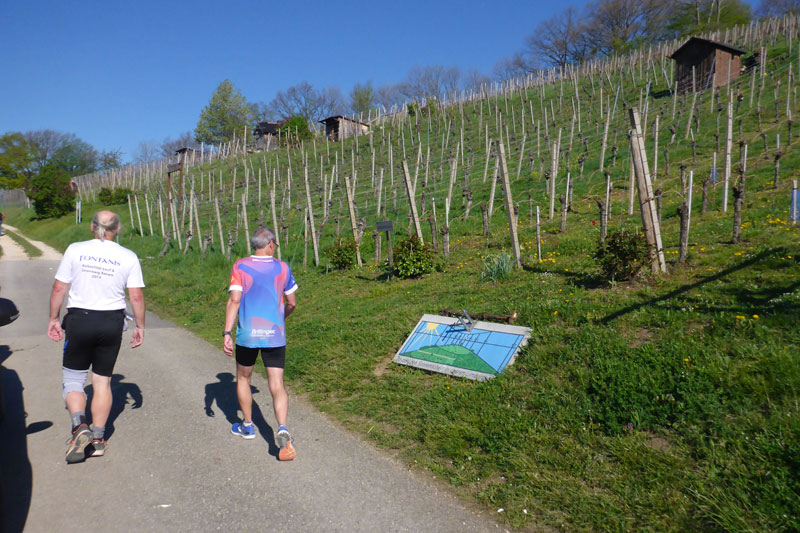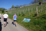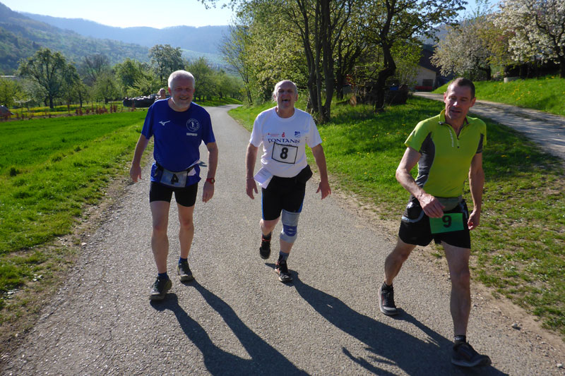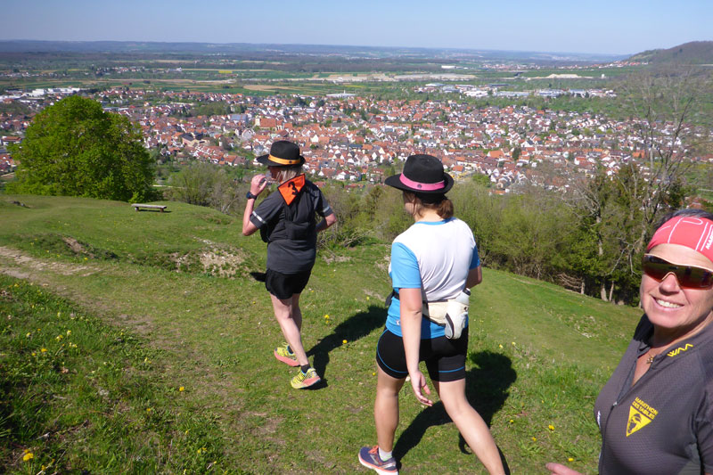 Runde 4. In Hepsisau kann ich Andreas mit der Nr. 12 überholen, ich kann wieder ganz gut laufen und mich ein Stück absetzen. Aber weit ist er nicht hinten. Auf der Limburg laufe ich auf Conny und ihrer Viererbande auf. Ein Selfie mit Conny. „Willst du uns jetzt kurz vor Schluss noch überholen?“ Bekomme ich zu hören. Ich muss, werde verfolgt von der 12, will noch meinen Platz halten. Pures Genießen klappt halt doch nicht immer, etwas Wettkampf macht dann auch wieder Spaß.