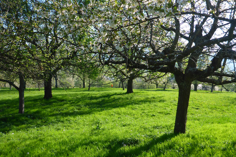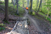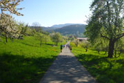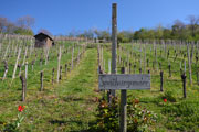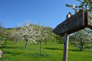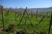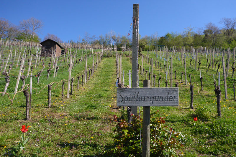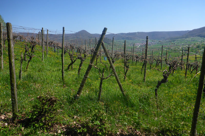 Wir durchqueren Hepsisau in der vollen Länge, am Ortsende geht es wieder aufwärts. Durch herrlich blühende Streuobstwiesen zieht sich die Straße in langgezogenen Serpentinen nach oben. Nach einem wunderbaren Downhill Trail durch den Wald steht die Besteigung der Limburg an. Auf der Südseite ziehen wir durch die Reben. Das Weinfeld an der Limburg ist mit genau 531,96 m ü. NN das höchstgelegene in Baden-Württemberg. Der größte Teil des erwirtschafteten Ertrags wird durch die Weingärtner-Genossenschaft Hohenneuffen-Teck als „Neuffener Täleswein“ in den Handel gebracht. Spätburgunder, Müller-Thurgau und noch ein paar andere Sorten sind beschildert.