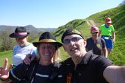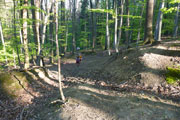 Auf dem Plateau sind keinerlei Mauerreste der früheren Burg-Ruine mehr vorhanden, der Verlauf der Grundmauern ist aber noch als schwache Erhebungen im Geländerelief sichtbar. Die Aussicht ist bei heute wolkenlosem Himmel grandios, bis zu den drei Kaiserbergen reicht die Sicht. Axel, Teddy und ich machen eine kleine Fotosession mit Selbstauslöser, dann geht’s wieder runter. Teddy jammert, für sein Knie ist das nichts.