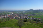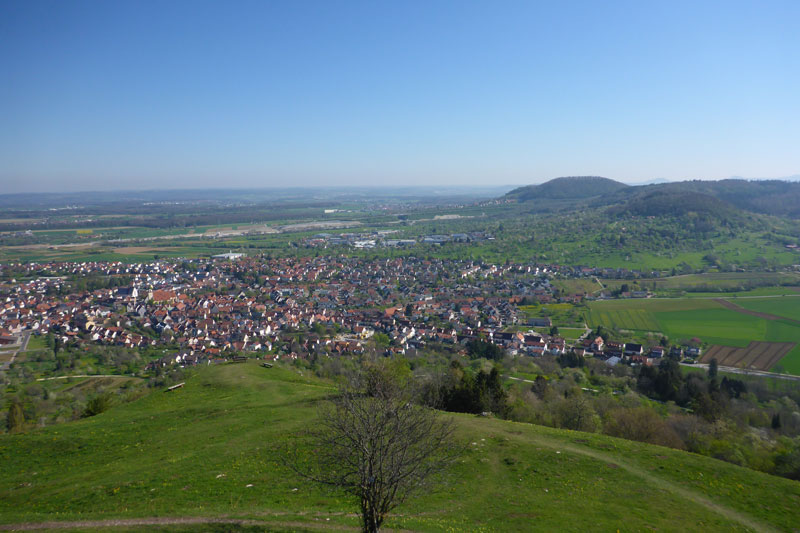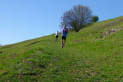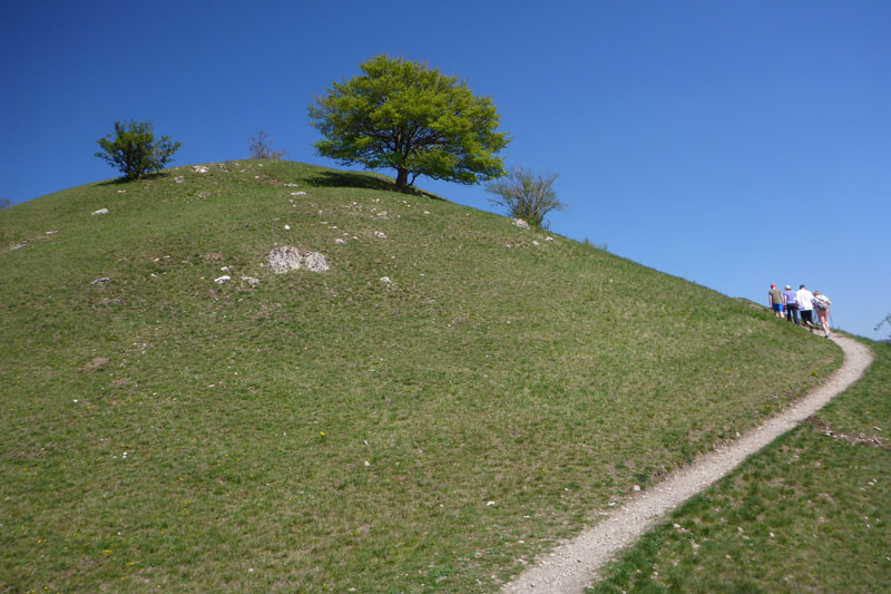 Nach durchqueren der Weinfelder haben wir etwa die Hälfte des Limburg-Aufstieges hinter uns, jetzt wird es deutlich steiler, etwa 100 Höhenmeter stehen noch an bis wir ganz oben sind. Der obere Teil ist nur mit Magerrasen und einigen, einzelnstehenden Linden bewachsen. Die kahle Kuppe ist die Folge jahrhundertelanger Beweidung mit Schafen. Betreten querfeldein ist nicht erwünscht, man soll sich nur auf den ausgetrampelten Pfaden bewegen. Seit 1990 ist das hier Naturschutzgebiet. Steil geht es rauf, die Serpentinen entschärfen den Anstieg aber spürbar.