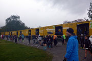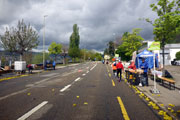 Am Strandbad Mythen-Quai angekommen finden wir ein großzügig angelegtes „Containerdorf“ vor, wo wir auch unsere Starterbeutel mit Wechselkleidung abgeben können. Über 10.000 solcher Starterbeutel müssen hier deponiert und sortiert werden. Alles ist perfekt organisiert und auch hier gibt es keine Warteschlangen. Doch kaum habe ich meinen Beutel in treue Hände gegeben, beginnt es zu regnen. Noch gut eine dreiviertel Stunde müssen wir auf den Start warten und so suchen wir uns eine halbwegs trockene Ecke. Viele Läufer verkrümmeln sich unter die Container, um trocken zu bleiben. Obwohl mich fröstelt, muss ich dennoch schmunzeln.