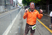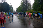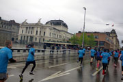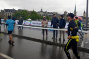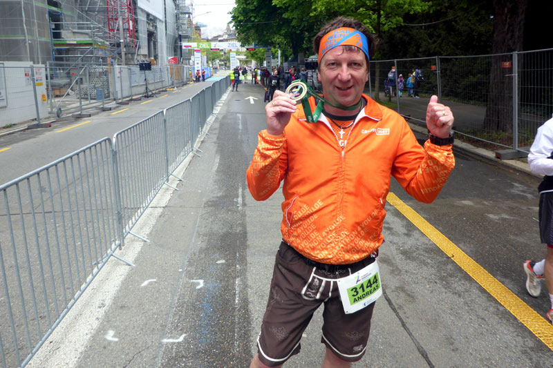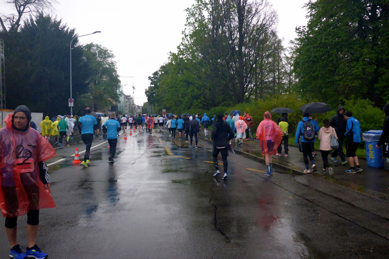 Kurz vor dem Start lässt der Regen aber nach und wir begeben uns in die Startaufstellung. Es sind sechs Startblöcke vorgesehen, wobei der erste natürlich der Elite vorenthalten ist. Mit der Startnummer 1 findet sich dort auch der kenianische Weltrekordläufer bei den Blinden, Henry Wanyoike ein. Die Startnummer 2 trägt die ebenfalls blinde Schweizer Topläuferin Chantal Cavin. Neben weiteren überwiegend afrikanischen Topathleten steht auch Langlauf-Olympiasieger Dario Cologna im ersten Startblock. Gemeinsam mit drei weiteren Langläufern will er sich den Sieg im Team-Run holen. Etwas weiter hinten, genauer gesagt im letzten Startblock sortiere ich mich mit Wolfgang ein. Er ist für Läufer mit einer zu erwartenden Zielzeit von 4:11 bis 5:30 Stunden vorgesehen und ich fühle mich dort gut aufgehoben.
