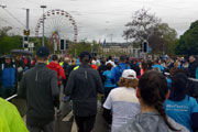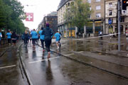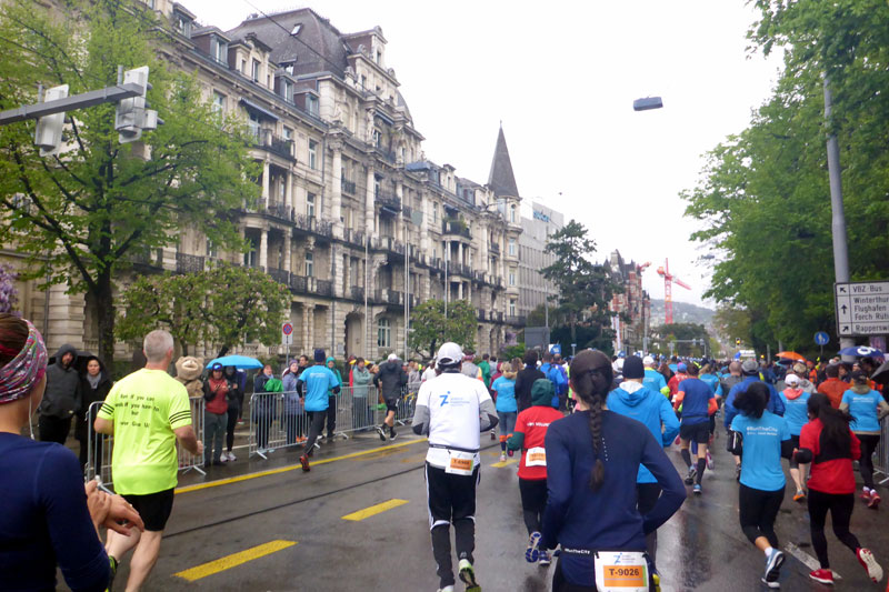 Um punkt 08:30 Uhr sehe ich, wie sich einige Luftballons in den wolkenbedeckten Himmel erheben. Der Start ist also freigegeben. Gleich geht`s los. Etwa fünf Minuten nach der Elite überquere auch ich die Startlinie und laufe den Mythen-Quai in nördlicher Richtung. Obwohl sich nun über 10.000 Läufer auf der Strecke befinden, kann man von Beginn an gut laufen und sein Tempo finden. Ein Lob hierfür gibt es auch vom Sprecher, denn offensichtlich hatten sich alle Teilnehmer richtig in die Startblöcke einsortiert. Eine Zugangskontrolle, wie zum Beispiel in Berlin gibt es in Zürich nämlich nicht.