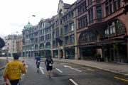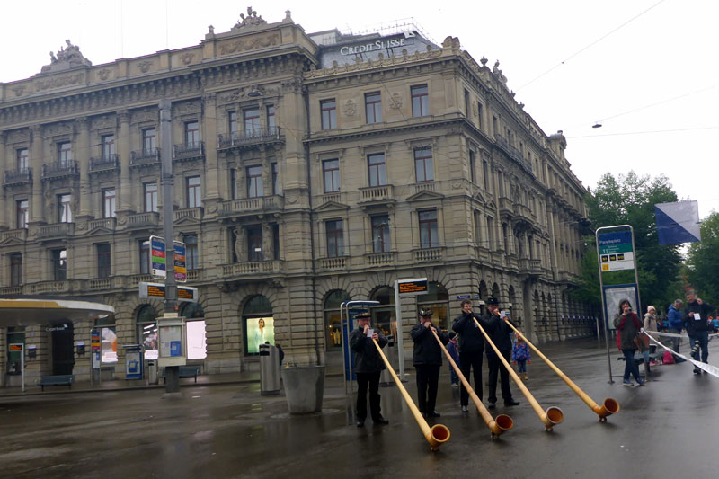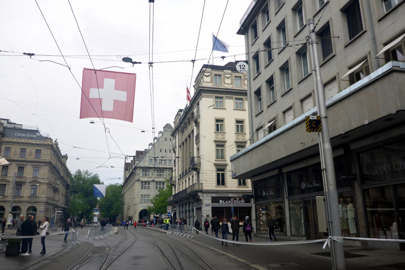 Kurz nach dem Sechseläutenplatz habe ich Kilometer 5 erreicht und überquere die Quaibrücke und erreiche ich zum zweiten Mal den Bürkliplatz. Von hier geht es nun nach rechts weg in die Bahnhofstraße. Das hört sich jetzt vielleicht jetzt etwas unspektakulär an, da es eine Bahnhofstraße in nahezu jedem Ort gibt, doch befinde ich mich nun auf einer der teuersten und exklusivsten Einkaufsstraßen der Welt. Gut anderthalb Kilometer laufe ich zwischen zahlenreichen Boutiquen großer Modedesigner, Schmuck- und Uhrengeschäften, sowie diversen Luxushotels hindurch. Auf meinem Weg zum Züricher Hauptbahnhof quere ich auch noch den Paradeplatz, dem Zentrum des Schweizer Bankenwesens. Die Straße ist mit zahlreichen Schweizer Flaggen geschmückt und so passt es auch, als ich die Klänge von Alphörnern vernehmen kann. Direkt am Paradeplatz kann ich die vier Alphornbläser dann auch erkennen und ihre Klänge begleiten mich noch nahezu bis runter zum Bahnhof.