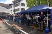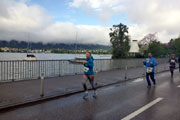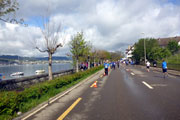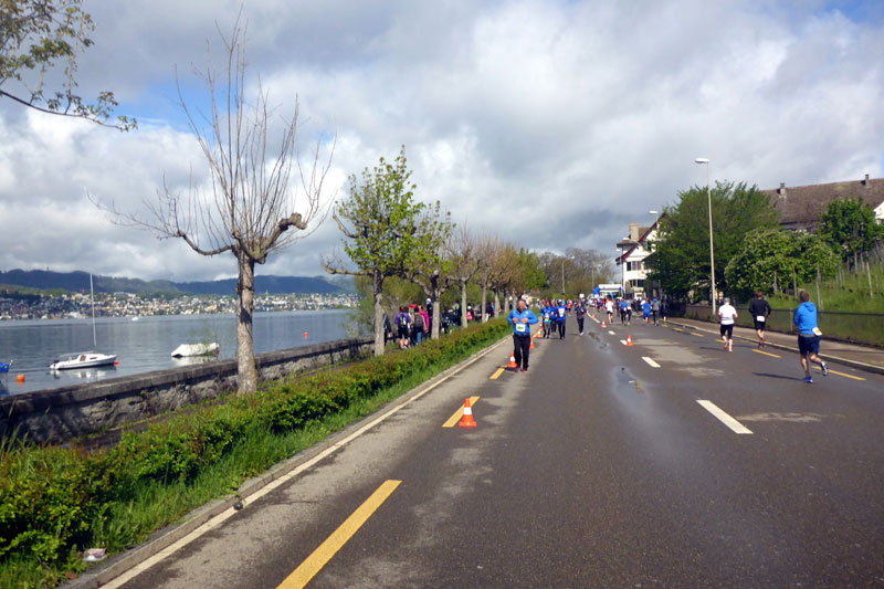 Kurz vor Kilometer 15 erreiche ich den Stadtteil Riesbach. Rechts von mir liegt nun der Zürichsee und so wird es auch bis Kilometer 25 Kilometer bleiben. Die Seestraße führt uns runter bis nach Meilen. Sehenswürdigkeiten hat der Zürich Marathon hier zwar keine zu bieten, dennoch ist die Strecke traumhaft schön. Immer wieder wandert mein Blick nach rechts über den See. In den Hügeln auf der anderen Seeseite hängen tiefe Wolken und bieten ein herrliches Bild mit dem teilweise doch noch blau gewordenen Himmel. Wir durchlaufen immer wieder kleinere Ortschaften, deren Namen ich mir auf die schnelle zwar nicht merken konnte, aber überall säumen Zuschauer die Strecke und diverse Bands sorgen auch hier für Stimmung. Es ist jetzt auch deutlich wärmer wie noch am Start, weshalb ich mich meiner Regenjacke entledige und sie um die Hüfte binde. Auch die Ärmel meines langen Laufshirts schiebe ich nach oben. |