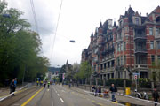 Schon nach wenigen Metern erreiche ich den General-Guisan-Quai, der nach dem General der Schweizer Armee benannt wurde und den Bürkliplatz mit dem landschaftlich sehr schön gestalteten Arboretum verbindet. Die großzügige Promenade säumen zahlreiche Baumreihen und man hat einen einzigartigen Blick übe die Zürisee und die dahinterliegenden Alpen. Vorbei am Bürkliplatz, wo ein kleiner Rummelplatz mit Riesenrad aufgebaut ist, überquere ich wenig später die Quaibrücke. Sie überspannt den zur Limmat verengenden Zürichsee und führt gut 121 Meter bis zum Bellevue, einem wichtigen Verkehrsknotenpunkt in Zürich. Heute stehen die zahlreichen Trambahnen aber still, denn das Bellevue gehört in diesem Moment den Läufern.