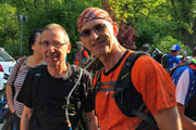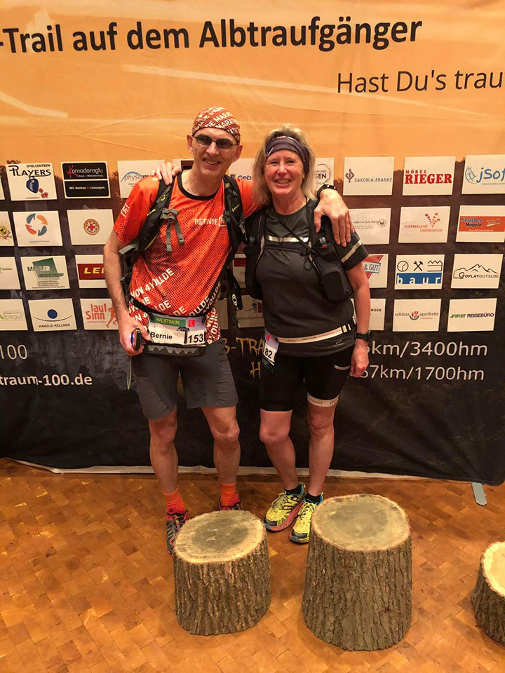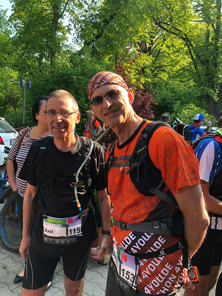 Um 8.10 Uhr findet das Briefing durch Andreas Bulling statt, einer der Gründer des ALB-Traum 100 e.V., neben Frank Weller und Andreas Löffler. Alle drei, bekannte Haudegen in der Ultraszene. Mittlerweile gehören acht Mitglieder dem Verein an, die sich die Unterstützung von sozialen Projekten als Ziel gesetzt haben. Als Vorbild dient ihnen die Brocken-Challenge, wo es ähnlich abläuft. Der wichtigste Hinweis für uns alle gilt der Orientierung: Immer den gelben Original Wandermarkierungen des Albtrauf bzw. der Löwenpfade folgen. An kritischen Stellen gibt es aber auch Markierungen in Form von Pfeilen auf dem Boden und einige eigene ALB-Traum-Wegweiser und auch Luftballons. Start ist neben der Jahnhalle. Bei traumhaftem Wetter wird kurz runtergezählt und der HALB-Traum ist gestartet. Im Übrigen gibt es heute nur eine Handstoppung der Zeiten und diese auch nur Minutengenau. Äußerst human ist das Zeitlimit für uns: 18:59 Stunden. Wer vorhat so lange unterwegs zu sein, dem wird aber dringend empfohlen eine Stirnlampe mitzuführen.