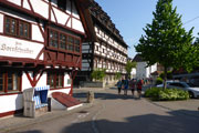 Der erste Kilometer führt uns durch die historische Altstadt von Geislingen. Wirklich schnell laufen darf hier noch keiner, der Abschnitt ist neutralisiert, auch die schneller wollen oder könnten, müssen hinter dem Führungsradler bleiben. Bleibt Zeit um die wunderschönen alamannischen Fachwerkhäuser zu bewundern. Rechts von uns liegt der Alte Bau. Er wurde um 1445 als achtstöckiger Kornspeicher errichtet und ist eines der größten Fachwerkhäuser Deutschlands. Heute beherbergt es das Geislinger Stadtmuseum und die städtische Galerie. Das älteste Gebäude der Stadt und des gesamten Landkreises Göppingen ist das Kornschreiberhaus, es folgt unmittelbar darauf. Es wurde 1397 über einem älteren Gewölbekeller erbaut und war ursprünglich mit Stroh gedeckt. Sehenswert ist auch das Alte Kauf- und Rathaus mit seinem auffälligen Glockenturm in der Hauptstraße die mit einem bunten Fahnenmeer geschmückt ist. Phantasievoll gestaltet von Geislinger Schülern und Schülerinnen im Kunstunterricht.