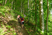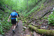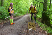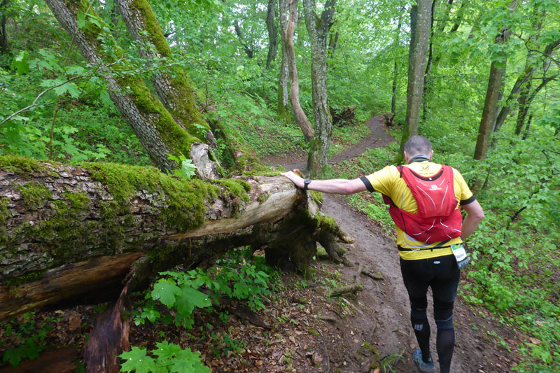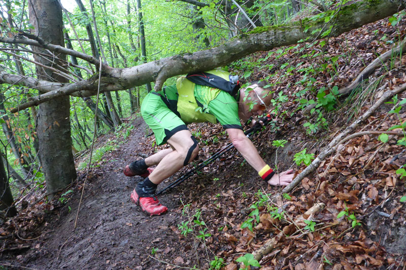 Der Einstieg ist bereits tierisch steil, ohne eine Windung werden wir anfangs mit bis zu 35 % Steigung gequält. Am Hexensattel bin ich wieder unkonzentriert, ich verpasse einen Abzweig und laufe geradeaus weiter durch den Wald auf den Haarberg. Bald bin ich mir aber meinem erneuten Malheur bewusst, da keine Löwenpfad-Schilder mehr zu entdecken sind. Es wurmt mich gewaltig. Etwas weiter links meine ich aber die Bergkante auszumachen und auch schon Stimmen aus der Richtung gehört zu haben. Ich beschließe nicht zurückzugehen, sondern querfeldein durch eine blühende Wiese mein Glück zu versuchen. Ich bin natürlich vorsichtig, das Naturschutzgebiet ist bekannt für seine zahlreichen und seltenen Pflanzenarten, darunter auch Orchideen. Nach hundert Metern erreiche ich tatsächlich wieder den richtigen Pfad der Wasserberg-Runde. Spaziergänger geben mir zu verstehen, dass auch schon einige Läufer mit Startnummern vorbeigekommen sind. Das ist zum zweiten Mal, gerade noch gut gegangen.