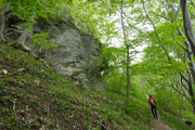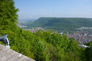 Auf etwa 700 Meter Höhe geht es auf wechselnden Untergründen 2,5 km in leichtem Auf und Ab weiter. Hier sind auch einige Asphaltabschnitte, inklusive Straßenüberquerung dabei. Da sollte man etwas wachsam sein. Ab Kahlenstein geht’s wieder runter. Die zwei dem Albtrauf vorgelagerten Felsen liegen oberhalb Bad Überkingen. Ja, hier kommt das bekannte Mineralwasser her. Wir passieren die Felsformation hinterhalb, auf ganz schmalen eingewachsenen Pfaden. Im Gestein liegt die 150 m lange Kahlensteinhöhle, seit 1972 ist der Höhleneingang aber mit einem Gitter verschlossen. Die 25 m hohen Felsen werden auch gerne zum Klettern verwendet. Von hinten bekommen wir aber relativ wenig von den Felsen zu sehen.