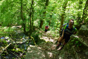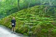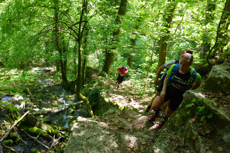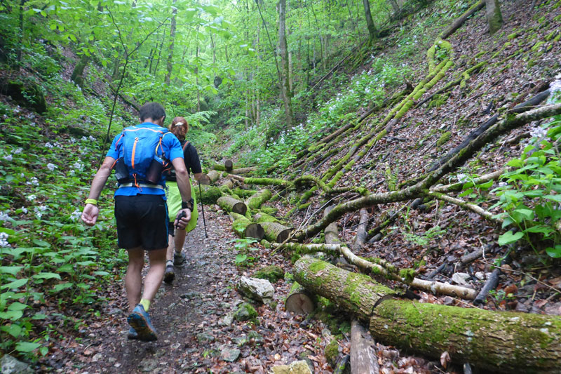 So nach etwa 7 Kilometern liegt unser erster Berg hinter uns. Für 3 km geht es auf dem breiten Autalweg wellig weiter durch das Naturschutzgebiet. Im Flow übersehen Axel und ich beinahe die wunderschön bemooste Felskaskade einer Karstquelle. Da müssen wir nochmal ein paar Meter zurück für ein Foto. Im März blühen hier die Märzenbecher zu hunderttausenden.