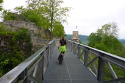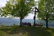 Direkt im Anschluss beginnt unser erster Anstieg. Für die Racer gilt ab hier: Feuer frei. Bereits die ersten Kilometer lösen bei mir Freudengefühle aus, auf herrlichen Single-Trails zieht sich unser Weg hinauf bis zum Ostlandkreuz. Häufig wird es für ein Gipfelkreuz gehalten, aber es ist ein Vertriebenendenkmal. Es wurde 1950 von der Landsmannschaft der Südmährer, zum Gedenken an die Toten und Vertriebenen des 2. Weltkrieges errichtet. Es ist das höchste derartige Denkmal. Die mit Kupferblech verkleidete Stahlkonstruktion ist 22,7 Meter hoch. Die Arme des Kreuzes haben eine Spannweite von 7,5 Metern. Vom Rand der Steinbrüstung hat man eine wunderbare Aussicht über Geislingen und bis ins untere Filstal und zum Hohenstaufen.