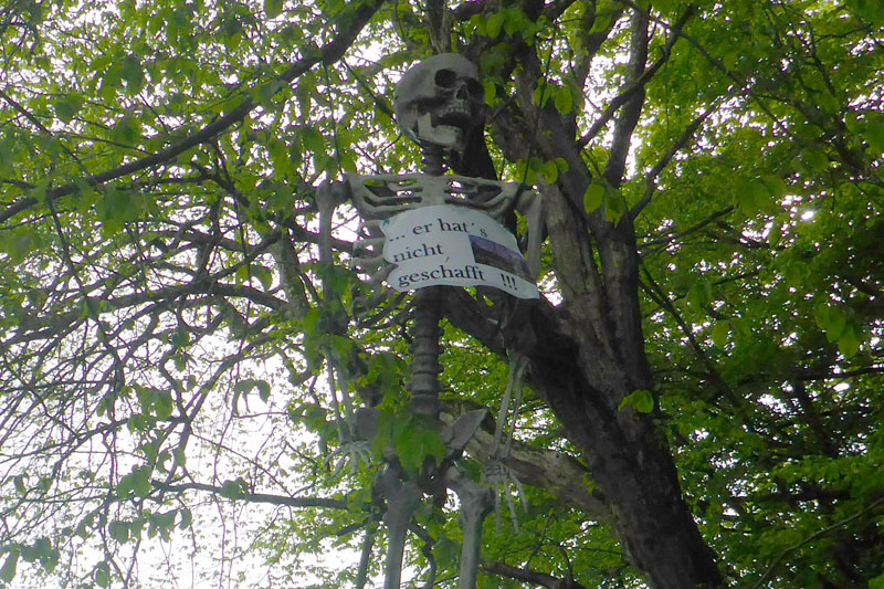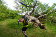 Viele Kilometer war ich ganz einsam unterwegs, jetzt kann ich wieder auf bekannte Gesichter aufschließen und sie auch überholen. Durch Wälder und Wiesen führen uns auf der Hochebene gut laufbare Wege immer leicht abwärts bis zum Dalisberg. Wir passieren eine mächtige, bereits teilweise verwitterte Wettereiche (km 25). Etwa 500 Jahre stand sie hier. Sie ist der Wappenbaum der Gemeinde Unterböhringen. 1999 wurde sie von Orkantief Lothar zerbrochen und gefällt. Es wurde aber bereits eine neue Eiche gepflanzt. Während der alte Baum zu Erde wird, soll der junge Baum zum neuen Wahrzeichen heranwachsen.