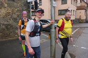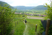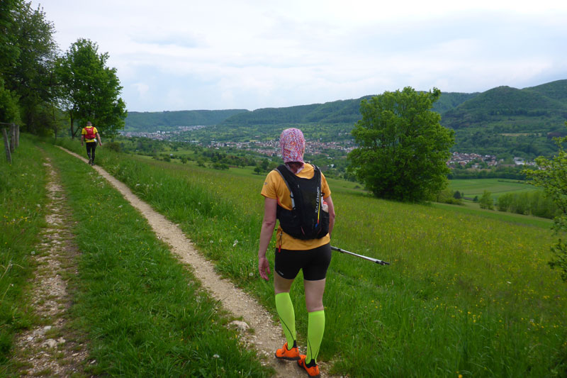 An der Bergkante hat man schöne Ausblicke nach Unterböhringen und ins Filstal. Etwas Sorge bereitet mir der Blick nach oben auf die Wolken am Himmel. Es zieht sich langsam bedrohlich zu. Der Abstieg erfolgt über schmale Pfade und Heideflächen. Vor mir kann ich Axel ausmachen, von dem ich mich eigentlich an VP1 abgesetzt habe. Lange hat’s gedauert bis ich wieder dank meiner Eskapaden aufgeholt habe. Die Hälfte unserer Bergbesteigungen ist geschafft, streckenmäßig fehlt noch etwas. 26,5 km liegen im Ort hinter uns.