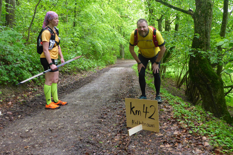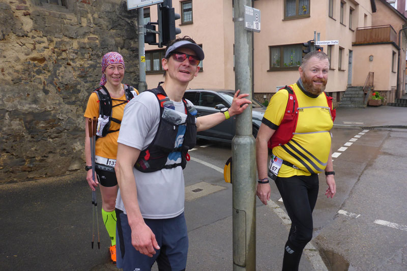 Nach VP1 trennen sich die Wege von ALB- und HALB-Traum. Für uns geht es noch ein Stück auf dem geteerten Ave-Maria-Weg abwärts nach Deggingen. Ich laufe geradeaus durch den Ort, kann aber seit geraumer Zeit keine Streckenmarkierungen und auch keine Mitläufer mehr ausmachen. Ziemlich verunsichert wende ich mich an einen Fußgänger, der kennt aber auch nicht den Weg zu den Löwenpfaden, würde mich aber eher geradeaus weiterschicken. Ich weiß nicht so recht? Ein Rennradler gesellt sich hinzu und erzählt, er habe sich ebenfalls verfahren, aber er hat auf seinem GPS den Kurs installiert. Nach einem Check ist klar, wir müssen zurück. Der Radler begleitet mich einige hundert Meter und führt mich wieder zurück auf den richtigen Kurs. Beim Schild „Da lang! H57“ fällt mir ein Stein vom Herzen. Puuh, nochmal Schwein gehabt, das hätte schlimmer werden können. Mit bestem Dank verabschiede ich mich vom Radler. Nach einiger Zeit kann ich auch wieder einen Mitläufer vor mir ausmachen, aber das hat natürlich viel Zeit gekostet.