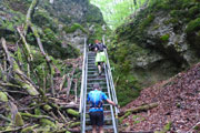Der Einstieg für unseren nächsten Aufstieg wird durch einen riesigen Pfeil und ein neonfarbiges ALB-Traum-Schild am Boden markiert. Treppenstufen führen uns steil hinauf zur Brunnensteighöhle und zum leider nicht gerade sehr ergiebigen wildromantischen Wasserfall. Der Pfad dahin ist dafür grandios.