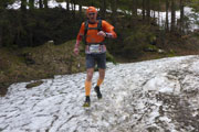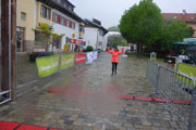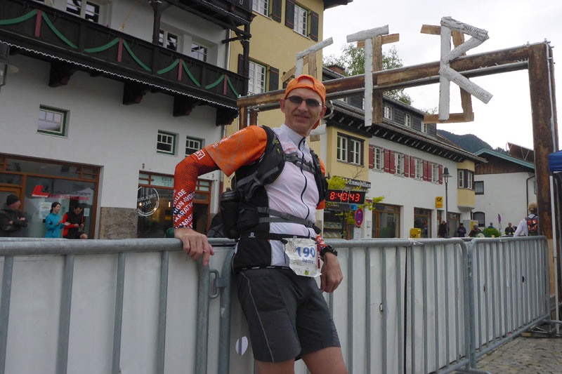 An der Bergstation (km 16,7) wird die Zwischenzeit gemessen, ich bin jetzt ziemlich genau zweieinhalb Stunden unterwegs. Beim nachfolgenden Downhill kann man es ordentlich laufen lassen. Bis auf einige kurze Unterbrechungen verläuft alles auf gut laufbaren Wirtschaftswegen. Das zügige Abwärtslaufen fordert aber auch einiges an Tribut, ziemlich erledigt erreiche ich nach 22,3 km den Zieldurchlauf in Marquartstein. Nur wenige Minuten vor meiner Ankunft sind die Teilnehmer des Halbmarathons gestartet, sie teilen sich größtenteils die zweite Hälfte des Kurses mit uns. Ich genehmige mir jetzt erstmal ein paar Minuten Pause um für den direkt darauffolgenden Anstieg wieder bei Kräften zu sein. Stefan schenkt mir Cola ein und ich bediene mich am reichhaltigen Büffet.