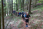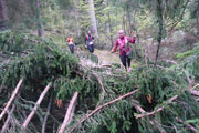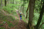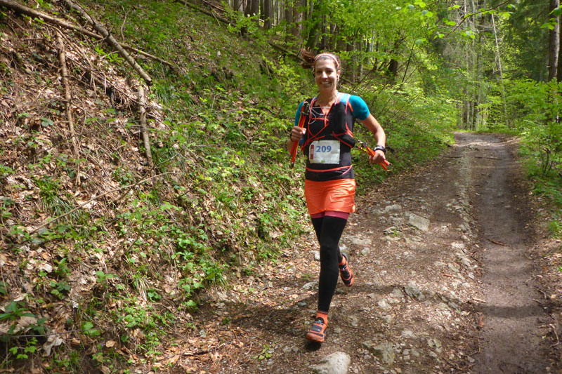 Von 10 wird gemeinsam runtergezählt und pünktlich geht es los. Wir laufen auf den ersten Kilometern den Ultras entgegen. Das Wetter sieht momentan super aus, immer wieder kommt sogar die Sonne für längere Abschnitte durch. Das soll sich aber im Laufe des Nachmittags ändern. An Rathaus, Kirche und Realschule vorbei durchqueren wir Marquartstein. Nach 400 Metern sind wir am Ortsrand und verschwinden im Wald. Nun steigt der Weg an und führt uns an einer Hofkapelle aus dem 18. Jahrhundert vorbei. Herrliche Single-Trails, immer leicht aufwärts erwarten uns. Der weiche Waldboden ist ein Traum. Eine Cheerleader-Gruppe in pink feuert uns euphorisch an. Einige Hindernisse in Form von Baumstämmen oder Gräben machen die Strecke abwechslungsreich und es sind auch immer wieder Abschnitte auf Forststraßen dabei. Alles noch nicht sonderlich steil, hier kann man noch laufen. Wir queren die Lifttrasse des Hochplatte-Sessellifts. Nach 4,5 km sind die ersten 250 Höhenmeter absolviert, es geht abwärts.