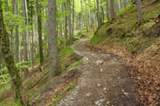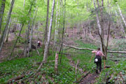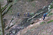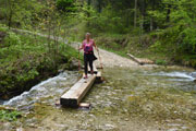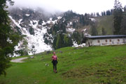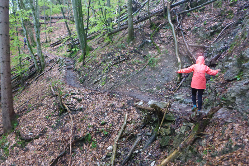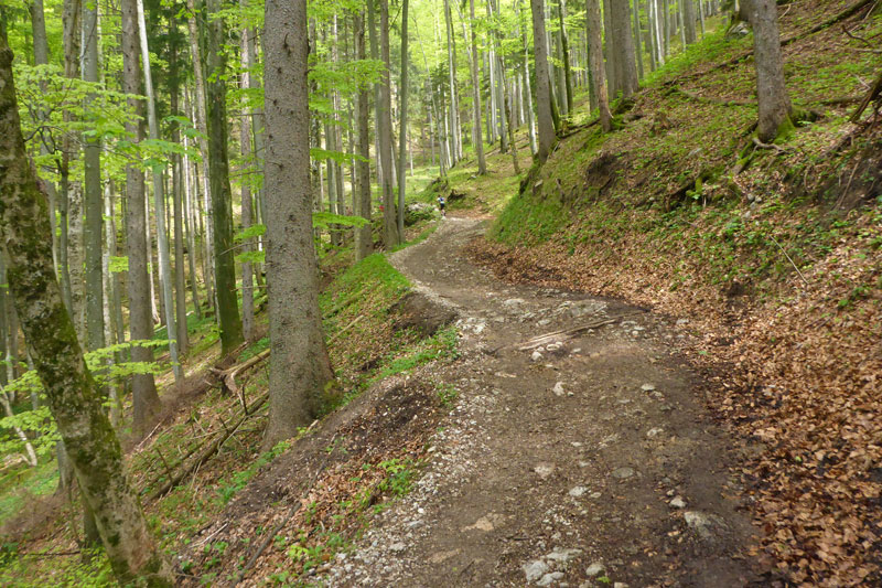 Ein kurzes Stück geht es noch abwärts, am Grießenbach beginnt unser erster längerer Anstieg hinauf zur Bergstation der Hochplattenbahn. Dabei sind über 500 hm auf den nächsten 5 km zu erklimmen. Steil geht es lange Zeit, immer in Nähe des Grießenbachs hoch. Nach einem rustikalen Trail folgt ein längerer Abschnitt auf komfortablen Schotterwegen. Den höchsten Punkt erreichen wir auf etwa 1200 m. Zur Bergstation geht es bereits wieder abwärts. Ein Schneefeld, es bleibt das einzige, bietet sich an für ein paar Fotos mit Moritz und Julia.