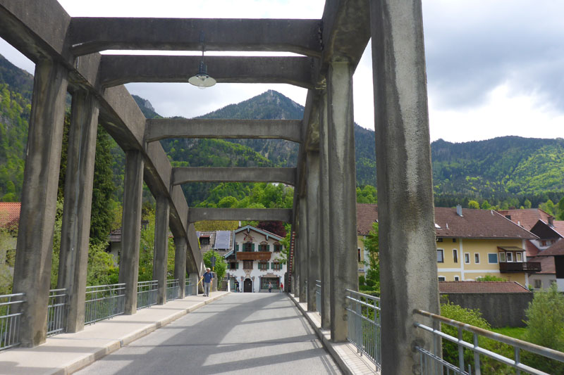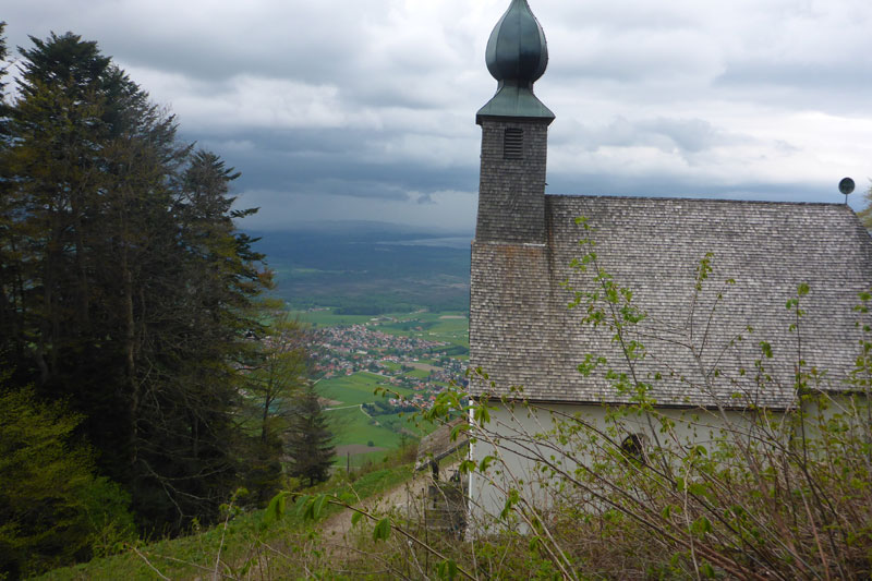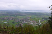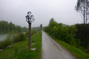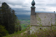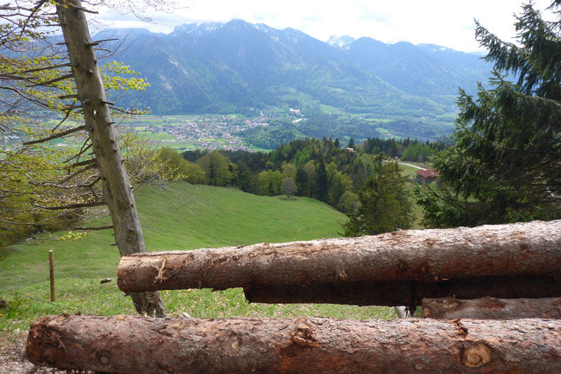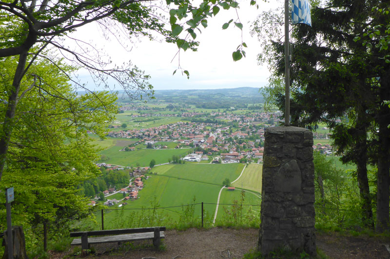 Hier geht es für mich aber irgendwie nicht mehr weiter. Der Aussichtspunkt liegt scheinbar nicht mehr auf unserer Strecke, ich habe mich ganz einfach verlaufen. Macht aber nix, 50 Meter muss ich aufsteigen und ich kann wieder die Markierungen auf dem Weg ausmachen. Alles ist gut markiert, ich habe mich nur von einem breiten Weg verlocken lassen und die Pfeile übersehen. Aber, ich bin nicht unglücklich, so habe ich jetzt zufällig das Denkmal gesehen und zudem auch einen ersten schönen Blick über das Achental bis hin zum Chiemsee einfangen können.