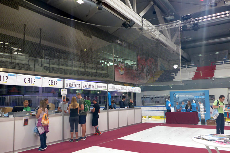 Nachdem uns die Eisheiligen in den letzten Tagen, ja schon beinahe Wochen kalte Temperaturen bescherten, freue ich mich auf ein sonniges Wochenende, das diverse Wetterdienste für das Marathonwochenende angekündigt hatten. Und tatsächlich war der Frühling zurück. So konnten wir gemeinsam den Freitag und Samstag für ein paar ausgiebige Touren durch die Stadt nutzen. Am Samstagnachmittag führte uns der Weg von der Altstadt auch zum Volksgarten im Ortsteil Parsch hinaus. Dort befindet sich die Eis-Arena, das Zuhause von Red Bull Salzburg, die in der EBEL (Erste Bank Eishockey Liga) regelmäßig ganz vorne mitspielen und auch schon mehrfach österreichischer Eishockeymeister wurden. Da die Saison bereits beendet ist, wurde die Halle erstmals für die Marathon-Messe, sowie für die Startnummernausgabe zur Verfügung gestellt.
