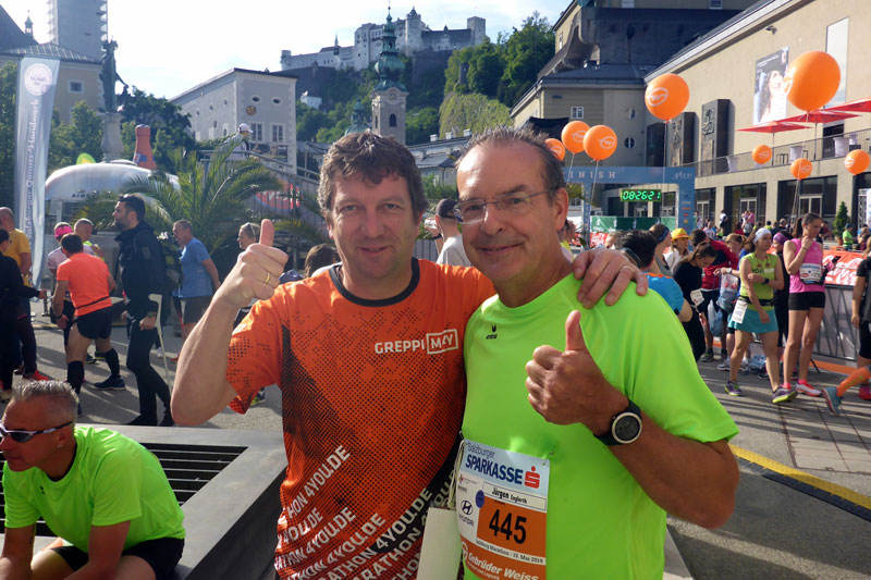 Ich schlenderte kurz durch die Sport Mall, bei der neben diversen Laufausrüstern, natürlich auch der ein oder andere Laufveranstalter auf sich aufmerksam machte. Dann holte ich mir nur noch kurz meine Startnummer und meinen Starterbeutel ab, was ohne Probleme über die Bühne ging. Nur kurz zögerte ich, da ich gewohnheitsgemäß erst mal in Richtung Marathon marschiere. Diesmal gab es meine Startnummer aber etwas weiter links bei den Halbmarathonis. Tatsächlich bin ich nach langer Zeit mal wieder beim Halbmarathon gemeldet, was meinem Plan für meinen einhundertsten Marathon in drei Wochen geschuldet ist. Etwas neidisch schiele ich aber doch zum Marathonstand hinüber. Gerne würde ich am Sonntag die zwei identischen Runden laufen, aber das kommt für mich leider nicht in Frage. So genieße ich mit meinem prall gefüllten Sackerl über der Schulter noch etwas die Sonne in Salzburg.