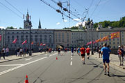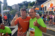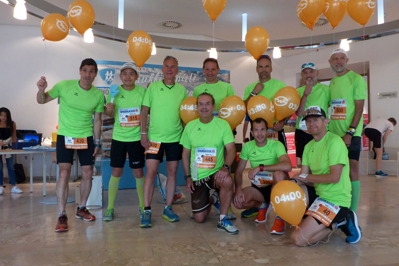 Auf meinem weiteren Spaziergang durch die Altstadt treffe ich auf Jürgen Englerth, Günter Dieplinger und Andrè Lange. Alle drei sind heute als Pacer beim Salzburg Marathon unterwegs. Mit Jürgen hatte ich schon im Vorfeld ausgemacht, dass ich ihn die erste Runde begleiten werde. So stand für mich ein entspannter Trainingslauf auf dem Programm, bei dem ich auch genügend Zeit zum Fotografieren finden würde. Schließlich habe ich das gesamte Pacer-Team des Salzburg Marathons um mich versammelt und die verbleibende Zeit bis zum Start ist äußerst kurzweilig. Rechtzeitig machen wir uns auf den Weg in die Griesgasse, wo die Startaufstellung stattfindet. Wir sortieren uns in den blauen Startblock ein, der für Finisher mit einer Zielzeit von über vier bzw. zwei Stunden vorgesehen ist, also ziemlich am Ende des Feldes. Pünktlich um 9:00 Uhr erfolgt schließlich der Start für die Elite, sowie den zweiten Block. Bis ich über die Startlinie laufe, werden noch gut 10 Minuten vergehen.